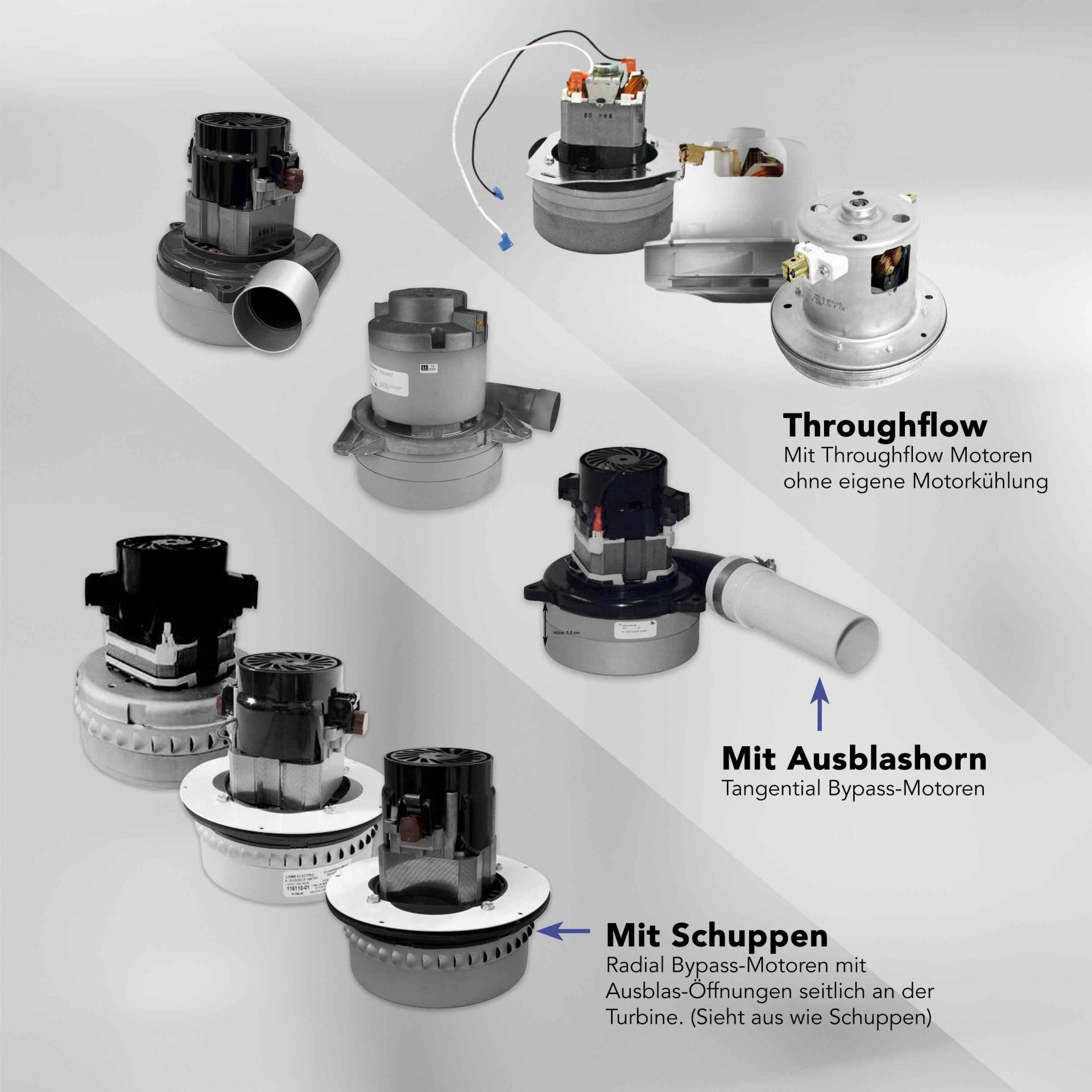 - Tangential Bypass-Motoren mit Ausblashorn (eigene Motorkühlung)